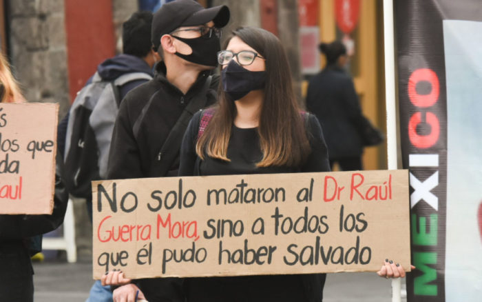 Familiares, amigos, colegas y pacientes del médico José Raúl Guerra Mora, asesinado el 2 de septiembre, participaron este lunes en una protesta en el Centro Histórico para exigir a las autoridades federales que se investigue el caso y dar con los autores materiales e intelectuales del homicidio.
