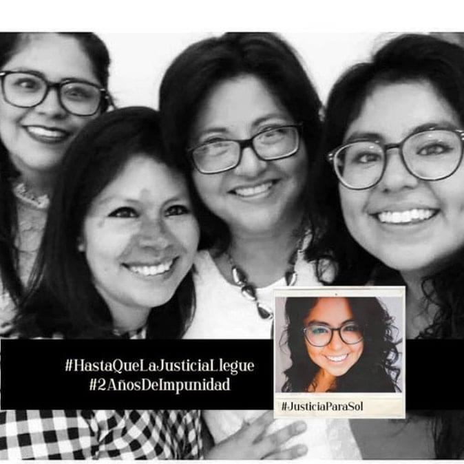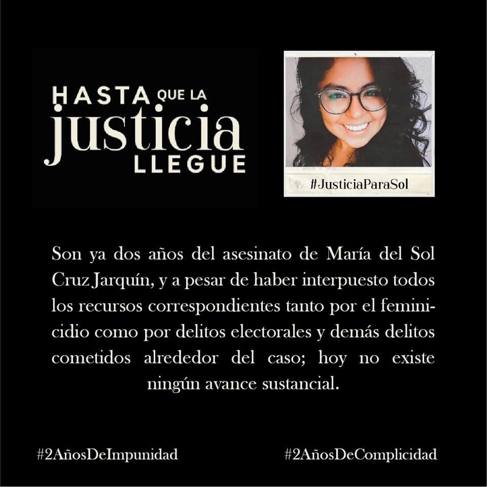 “A unos días de cumplirse dos años del asesinato de María del Sol Cruz Jarquín, alzamos la voz de manera virtual para denunciar que hemos testificado actos de complicidad, simulación e impunidad total. Agradezco su solidaridad”, expresó Soledad Jarquín.