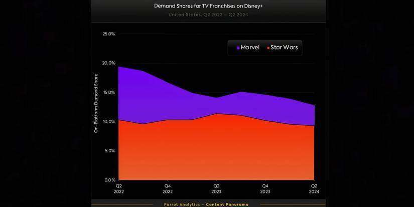 Loro nota que Ambas franquicias están viendo rendimientos decrecientes.con demanda de Ahsoka y El acólito no lograr igualar el éxito anterior con El mandaloriano. Aun así, está bastante claro que la demanda de guerra de las galaxias se ha mantenido relativamente estable, a diferencia de Marvel, donde la demanda ha caído un 6,6% según la medida de Parrot en los últimos dos años. Ambos todavía tienen un rendimiento superior para Disney+ en comparación con la participación del catálogo; en el segundo trimestre de 2024, el 22,1% de la demanda de Disney+ fue de Marvel o guerra de las galaxiasaunque estos representan solo el 12% de los programas de la plataforma.