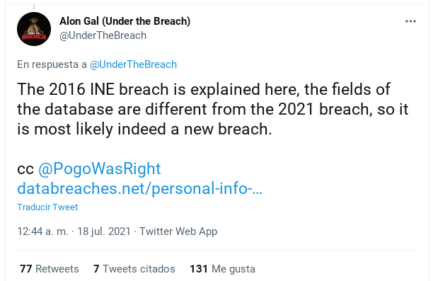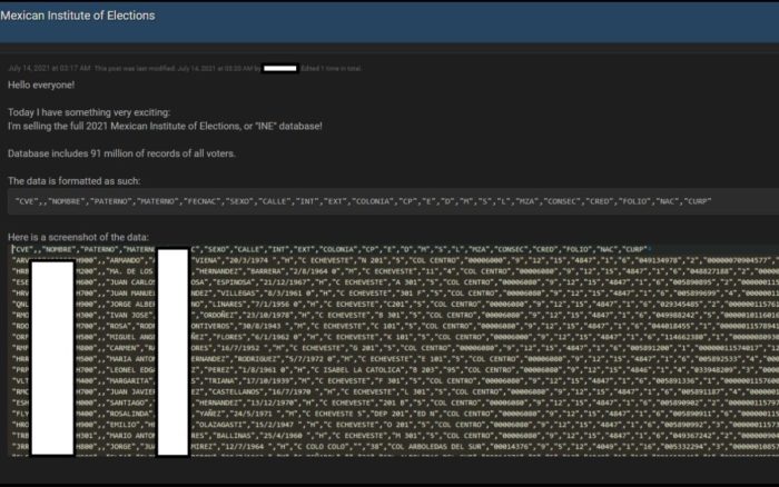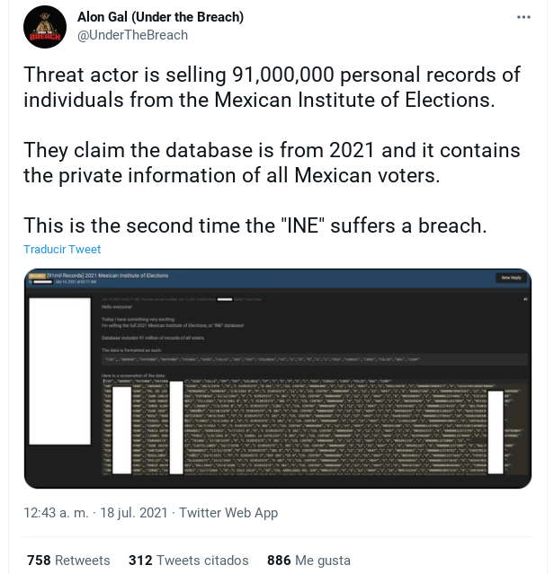 “Alguien está vendiendo 91 millones de registros personales de individuos del Instituto Mexicano de Elecciones”, publicó Alon Gal a través de su cuenta @UnderTheBreach.