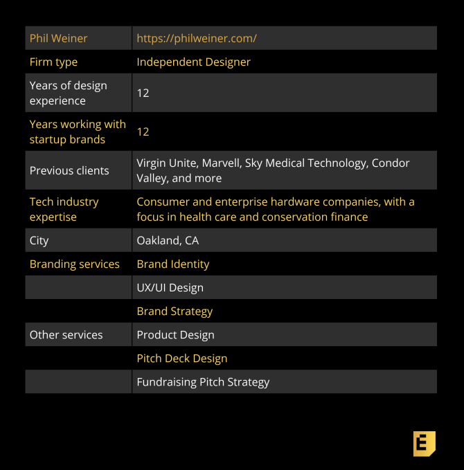 Como ex empresario convertido en diseñador independiente, Phil Weiner obtiene la vida de inicio. A menudo se describe a sí mismo como un segundo co-fundador para sus clientes, sin temor a las llamadas de las 2AM y preparando cubiertas de lanzamiento para los inversores. Es un director creativo “de pila completa” con sede en Oakland, CA, con una pasión por enfrentar la tensión cultural. Aprenda más sobre por qué el diseño corre en su sangre, su filosofía de marca y más.