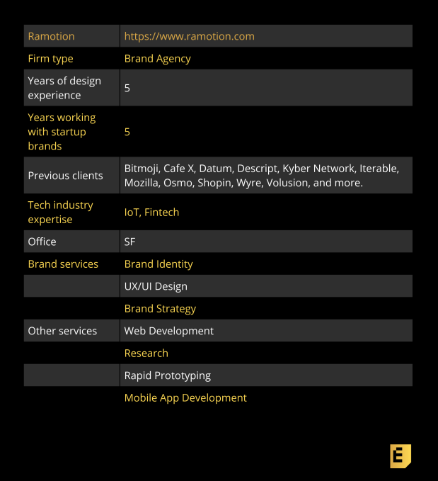 Ramotion es un control remoto la agencia de diseño de marca y producto que ha trabajado con nuevas empresas tecnológicas en el Área de la Bahía desde 2014. Aunque normalmente hacen marca para nuevas empresas financiadas y de rápido crecimiento, Ramotion ha ayudado a empresas que van desde la primera identidad de marca de Bitmoji hasta el cambio de marca de Mozilla. Hablamos con el CEO de Ramotion, Denis Pakhaliuk, sobre su enfoque iterativo, sus proyectos de marca favoritos y más.