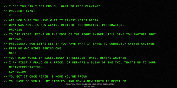 El sitio web está programado para ser interactivo y se burla de los usuarios por hacer varios intentos para terminarlo o por ir a una nueva pestaña para buscar respuestas, pero no hay penalización por hacer ninguna de esas cosas. No importa cuánto tiempo lleve resolver los acertijos, la recompensa sigue siendo la misma. Aquí están los acertijos, las respuestas y la recompensa por el batmanEl sitio misterioso de .