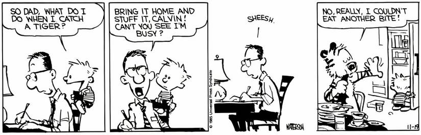 mientras que el primero Calvino y Hobbes El cómic mostró cómo se conocieron Calvin y Hobbes, este establece por qué y cómo se hicieron (y siguieron siendo) amigos. Después de que Calvin atrapa a su tigre, le pregunta a su padre qué hacer a continuación. El padre de Calvin le dice que diseque el tigre, que es lo que haría un cazador para conservar el cadáver del tigre como trofeo. Pero Calvin considera que eso significa alimentar al tigre con tanta comida como pueda hasta que esté “relleno”.