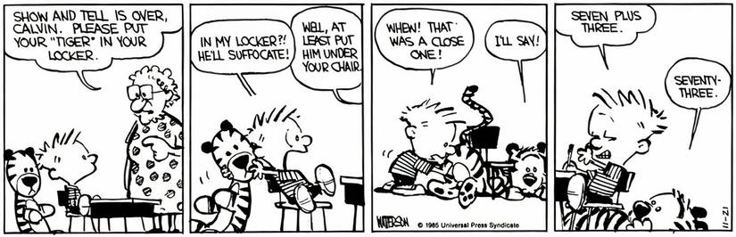 en esto Calvino y Hobbes En la tira cómica, Calvin lleva a Hobbes a la escuela para mostrarlo y contarlo, y su maestra le dice que ponga el tigre de peluche en su escritorio. Si bien este cómic confirma además que cualquiera que no sea Calvin ve a Hobbes solo como un animal de peluche, también establece la broma más larga de toda la serie. Mientras Calvin está trabajando en una tarea de matemáticas, le pregunta a Hobbes qué es 7 más 3, a lo que el tigre antropomórfico responde: 73.