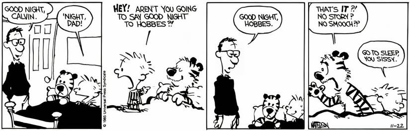 Mientras el padre de Calvin está arropando a Calvin y Hobbes en la cama, se va sin darle las buenas noches a Hobbes. Calvin le grita a su padre que regrese y le dé las buenas noches al tigre, lo que el padre de Calvin hace rápidamente (sin falta de sarcasmo en su voz). Pero eso no fue suficiente para Hobbes, ya que quería un beso de buenas noches y un cuento antes de dormir. Sin embargo, Calvin parecía satisfecho con el menosprecio y le dijo a Hobbes que se fuera a la cama, llamándolo “marica” mientras lo hacía.