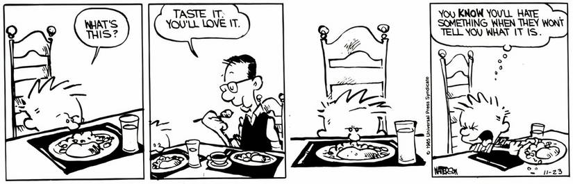 en esto Calvino y Hobbes strip, Calvin está sentado a cenar con su padre, aunque tiene sus reservas. La comida que le han servido a Calvin no le parece muy apetecible al niño de seis años, y cuando le pregunta a su padre qué es, el padre de Calvin simplemente dice: “Pruébalo. te encantará“, evitando la pregunta por completo. Pero Calvin sabe exactamente lo que significa esa respuesta y está seguro de que cualquier cosa que tenga frente a él será repugnante.