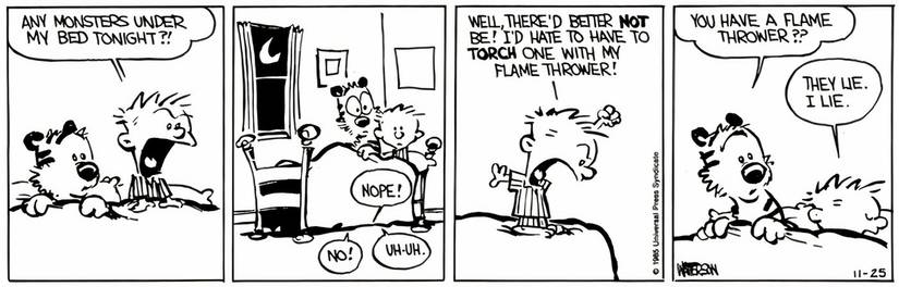 Incluso después de que el padre de Calvin lo comprobara (antes de ser confundido con un monstruo), Calvin y Hobbes todavía no estaban convencidos de que no hubiera monstruos debajo de la cama. Entonces, Calvin decide hablar directamente con los monstruos, advirtiéndoles que tiene un lanzallamas y que no dudará en usarlo con ellos. Esto hace que los monstruos “imaginarios” debajo de la cama le tengan miedo a Calvin, y todos niegan su propia existencia para evitar ser quemados.