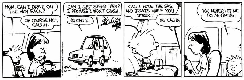 Cuando Calvin viaja en el auto con su mamá, le pregunta si sabe conducir. Obviamente, como Calvin sólo tiene seis años, su madre dice que no. Calvin luego hace pucheros, diciendo que su madre nunca le deja hacer nada, sin entender en lo más mínimo que sus peticiones están fuera de discusión. Si bien esta tira cómica es un arco independiente que simplemente muestra lo divertido que es Calvin por sí solo (al igual que la primera vez que Calvin estuvo sin Hobbes), en realidad establece un arco narrativo futuro, uno de los más caóticos.