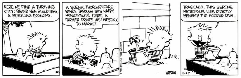 Calvino siempre ha exhibido algunas tendencias malvadas en Calvino y Hobbesy eso comenzó en esta tira cómica. Calvin construye una ciudad imaginaria en su arenero, una que, según explica, es próspera y serena. Pero entonces, Calvin llena un balde de agua para inundar la metrópoli, mira directamente al lector y dice: “Trágicamente, esta serena metrópolis se encuentra directamente debajo de la presa Hoover…“.