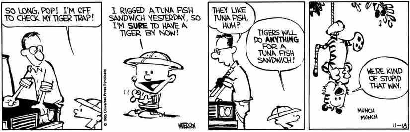 Calvin pone un sándwich de atún en medio de una trampa y Hobbes felizmente se deja capturar. con la promesa de comida gratis. Este cómic no sólo revela cómo se conocieron Calvin y Hobbes, sino que también establece el famoso amor de Hobbes por la comida, algo que sigue siendo un pilar a lo largo de la serie.