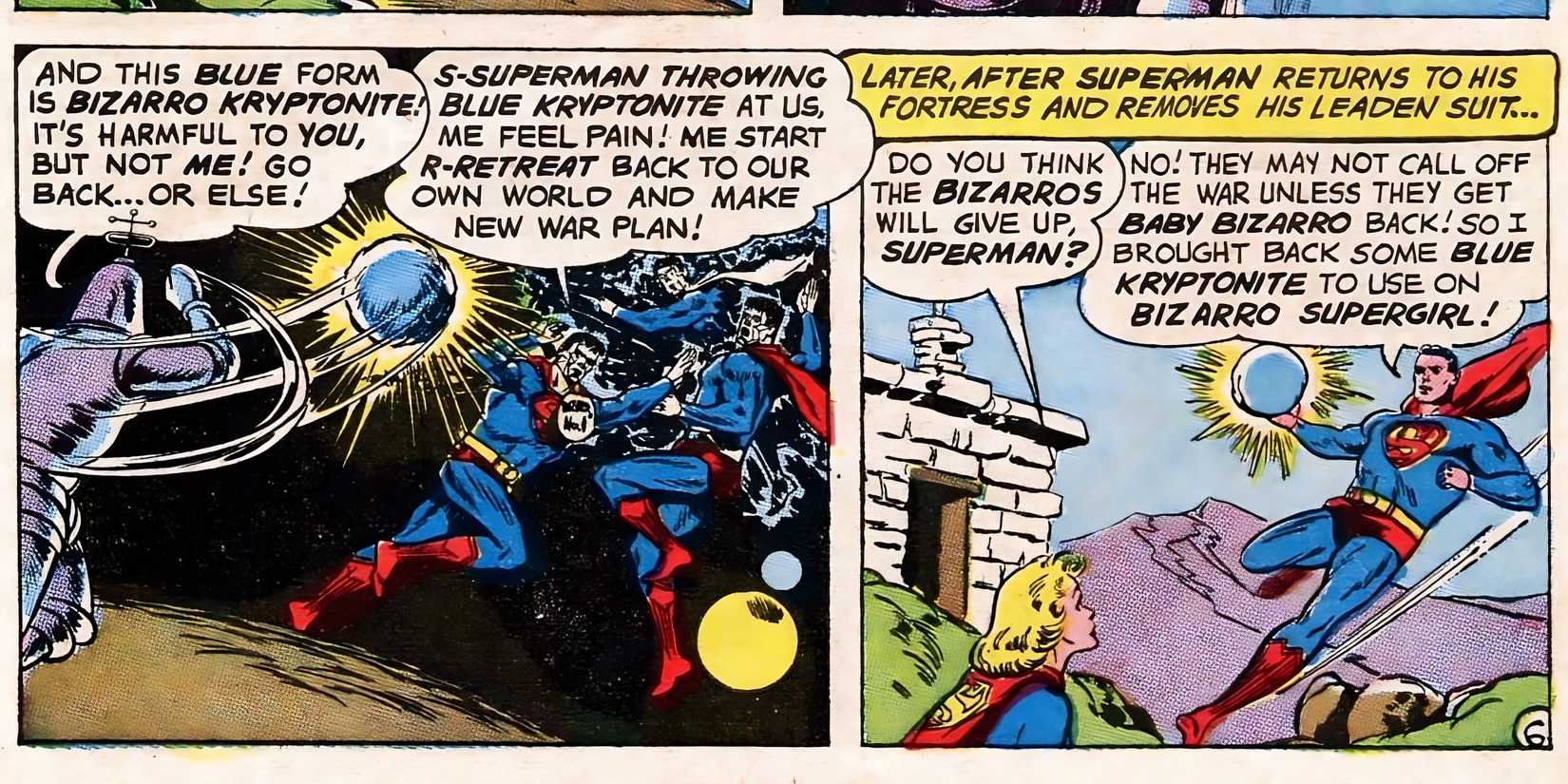 Los efectos de la kriptonita azul también han sido increíblemente variados a lo largo de las continuidades, pero es más frecuente Se sabe que afecta a los Bizarro Kryptonianos. que sus homólogos Prime. Después de la crisis, la kriptonita azul en realidad revirtió los efectos de la realidad alterada de Superman, aumentando significativamente su inteligencia. En la continuidad posterior a la crisis infinita, la kriptonita azul tuvo el efecto contrario, matando lentamente a Bizarro al igual que la kriptonita verde le hace a Superman. Más recientemente, la kriptonita azul se ha relacionado con causar una muerte espiritual en lugar de física.