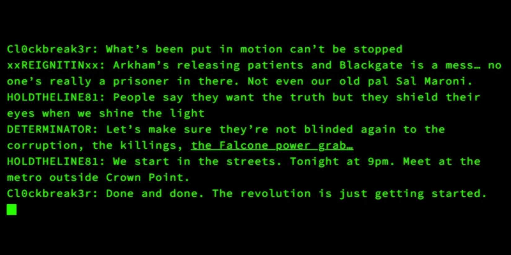 “Ya han visto el verdadero rostro de Gotham. Juntos lo hemos desenmascarado. Su corrupción, su perversión disfrazada de renovación”.