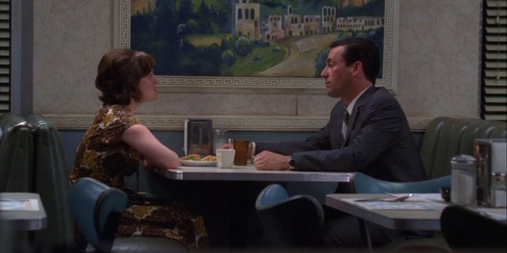 Los sentimientos positivos de Hamm sobre Hombres Locos“La maleta” son ciertamente comprensibles. Dentro de él, tanto Don como Peggy están poniendo todas sus cartas metafóricas sobre la mesa. Pero el personaje anterior, en particular, golpea algunas notas emocionales muy contrastantes a lo largo del episodio. Su noche / mañana con Peggy lo ve alzando la voz hacia ella con frustración de jefe desde el principio. Sin embargo, al final del episodio, lloró en su presencia, le confió que Anna Draper, recientemente fallecida, era la única persona que realmente lo conocía (refiriéndose a la historia real de Don). Hombres Locos identidad, así como su auténtico mundo interior), e incluso colocó cariñosamente su mano sobre la de ella después de que los dos personajes hayan sido tan honestos y compasivos el uno con el otro a lo largo de la historia. Hombres Locos episodio de la temporada 4.