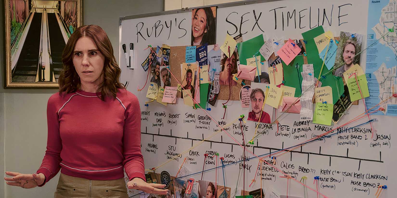Aunque Ruby comienza soltera en el programa original de Peacock, rápidamente se encuentra en el centro de un triángulo amoroso entre su hastiado exnovio Richie y su dulce cliente de planificación de fiestas Isaac. Aunque siente algo por Isaac, se da cuenta de que no puede acostarse con él porque morirá. La pareja también no coincide en que ella reconoce que es desordenada mientras que a él lo ve como amable y considerado. Por otro lado, puede tener todo el sexo que quiera con Richie porque él es su “vacío sexual”. También ve a su ex como igualmente imperfecto y neurótico, lo que los hace complementarios.