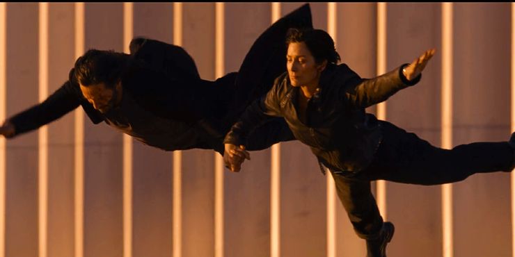 Después de que el Analista activó el Modo Enjambre, lo que provocó que todos los habitantes de la píldora azul del simulacro frustraran a la pareja, Neo y Trinity se encuentran acorralados en una azotea y toman la decisión de saltar juntos. Sin embargo, a mitad del salto, se revela que Trinity ahora puede volar, ya que ella es quien levanta a Neo en el aire sin ayuda de nadie. Resurrecciones, como sus predecesores, cuestiona y subvierte el concepto del Uno, estableciendo que los dos son aspectos integrales de un todo, compartiendo los poderes previamente reservados para iteraciones de “la anomalía” en cada versión de la matriz. Como la versión actual de la matriz dependía en gran medida de los códigos fuente de Neo y Trinity, dos seres tan irrevocablemente entrelazados entre sí, esto posiblemente les otorga a ambos los poderes atribuidos al Uno de Matrix. El amor, después de todo, es un acto de democratización, y es posible que Trinity comprenda de manera innata la naturaleza de la matriz, así como Neo, envalentonado por la pureza de su vínculo. Más adelante, en la escena final, se muestra que tanto Neo como Trinity son capaces de volar, por lo que es posible que sus poderes sean compartidos debido a su relación simbiótica.