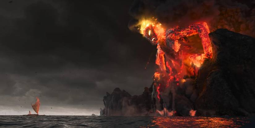 Moana nota que Te Ka no puede tocar el agua, lo que explica por qué el océano no puede entregarle el corazón.