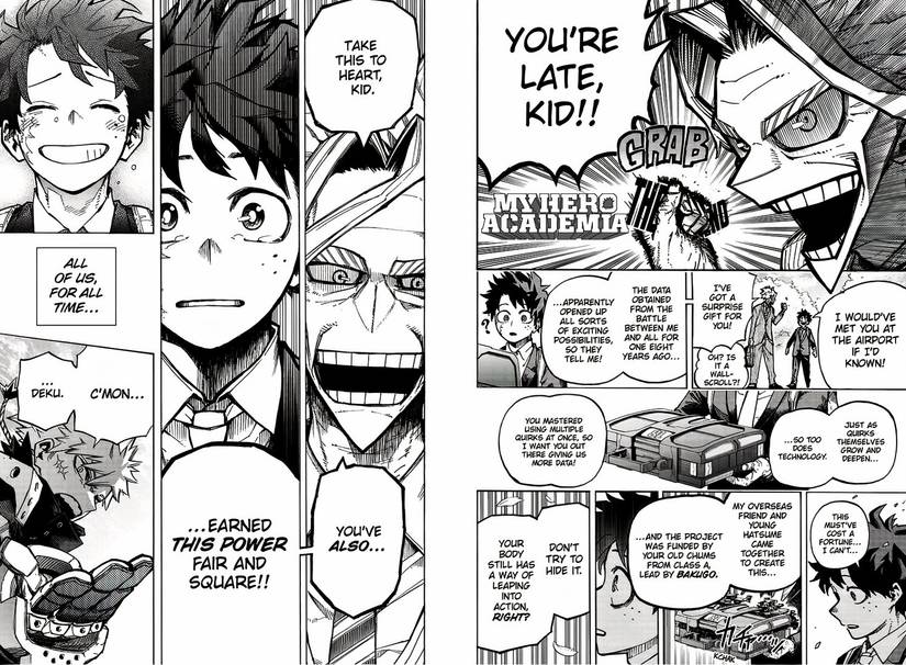 El capítulo final también revela que las brasas de One For All finalmente desaparecieron para siempre. Sin embargo, hacia el final del capítulo, All Might le entrega a Deku un traje mecánico creado por Hatsune Mei y un amigo extranjero de All Might, que fue financiado por los ex alumnos de la Clase 1-A. Armado con el nuevo traje de batalla, Mi academia de héroeEl capítulo final termina con Deku teniendo la oportunidad de ser un héroe una vez más junto a sus amigos.