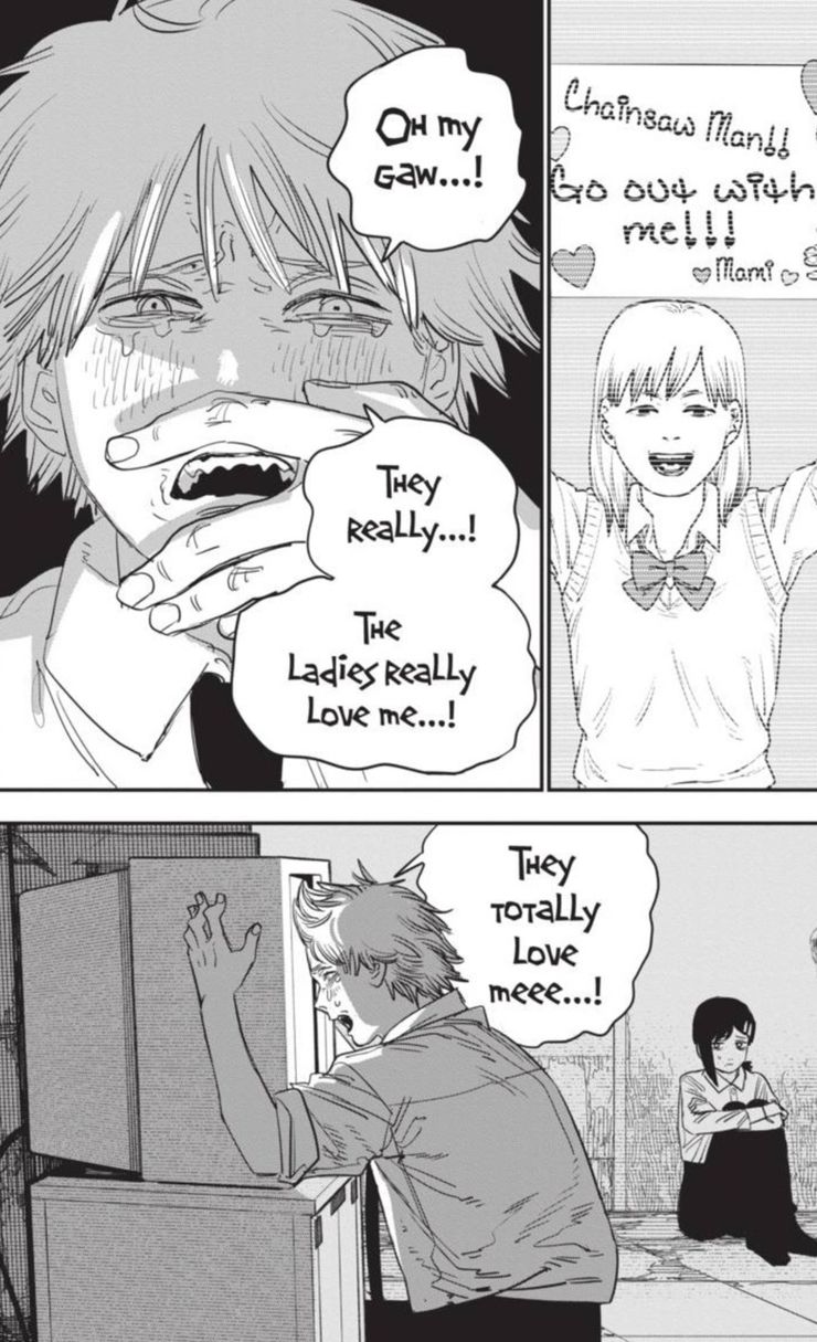 En el capítulo 93 de Hombre motosierra Podría decirse que Denji debería estar en su punto más bajo. Aunque Denji acababa de vencer una gran amenaza, muchos de sus camaradas cayeron y el gran mal de la serie se reveló. Como resultado, Denji se ha refugiado en una casa segura para asegurarse de que no lo descubran. Allí, Denji ve un noticiero que cubre las reacciones a la última batalla de Chainsaw Man. Específicamente, Denji ve a chicas de su edad alabando a Chainsaw Man y diciendo que les gustaría salir con él. Siendo perpetuamente hambriento de afecto, Denji no puede evitar llorar al pensar en tantas chicas que le gustan, lo que lleva al panel ampliamente utilizado como base para muchos memes.