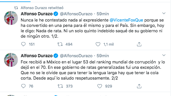 Esta mañana, Durazo dijo que nunca le había contestado nada a Fox, quien “se ha convertido en una pena para él mismo y para el país”, pero ahora le aclara que no tiene “nada de rata“, pues “ni un solo quinto indebido saqué de su gobierno ni de ningún otro”.