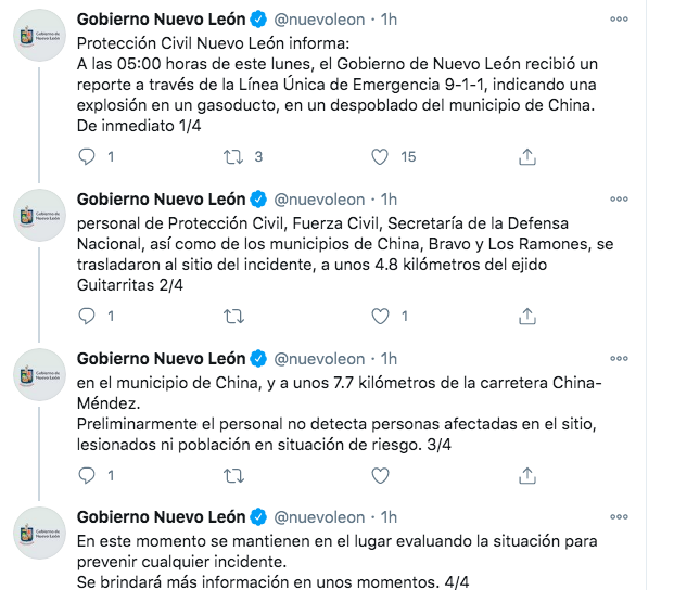 En una tarjeta informativa se informó que personal de Protección Civil de Nuevo León, en coordinación con Petróleos Mexicanos, se encuentran en el lugar y trazan maniobras para el cierre de válvulas.