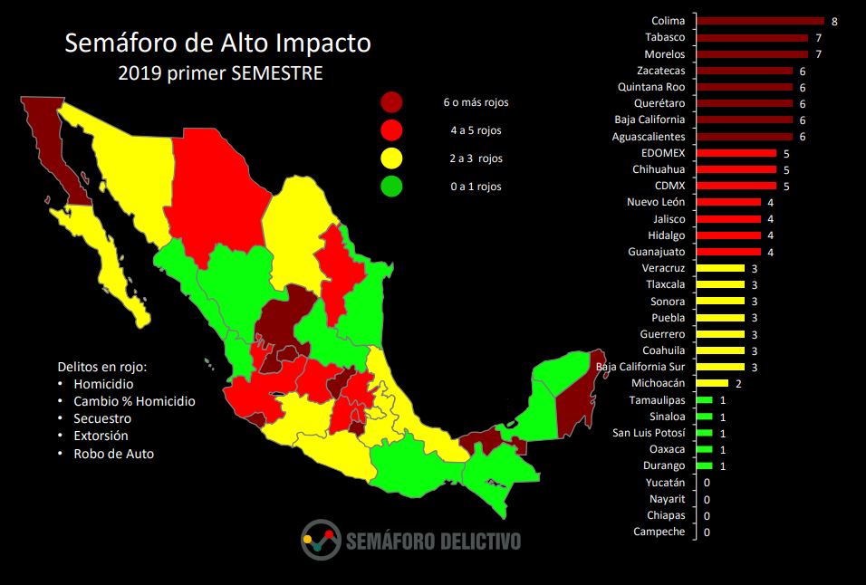 En el Semáforo de Alto Impacto, que considera no sólo las tasas de homicidio sino el resto de delitos de crimen organizado como el secuestro, la extorsión, el narcomenudeo y el robo de vehículo, los estados peor evaluados son: Colima, Tabasco, Morelos, Zacatecas y Quintana Roo.
