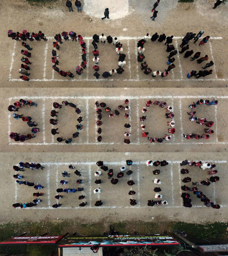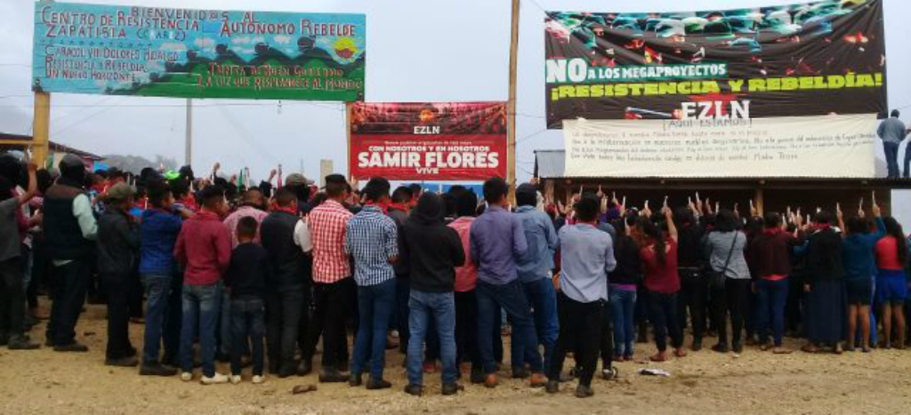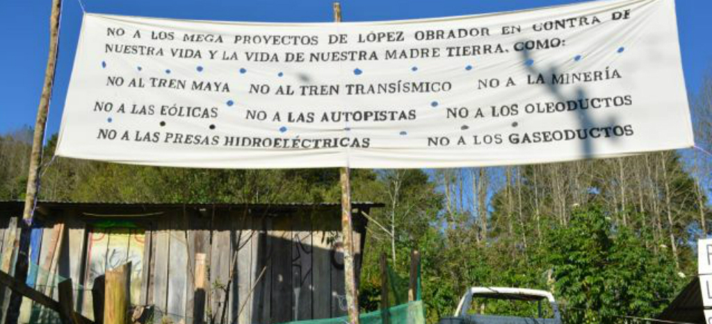 “¡Aquí estamos! La defenderemos a nuestra madre tierra hasta morir si es preciso. No a la militarización de nuestros pueblos originarios. No a la guerra de exterminio de López obrador. No a los megaproyectos del sistema capitalista. No al tren maya. No al tren transístmico. No a las autopistas. No a los gasoductos. Que vivan [email protected] [email protected] luchadores/as caí[email protected] en defenza (sic) de nuestra madre tierra”, señala una lona colocada en la sede del EZLN en el poblado Dolores Hidalgo, en la zona indígena de Ocosingo.