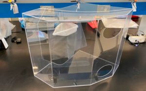 La campana de protección para intubación se diseñó en el Laboratorio Nacional de Soluciones Biomiméticas para Diagnóstico y Terapia, de la Facultad de Ciencias, y está hecha de acrílico transparente de 3 milímetros de grosor.