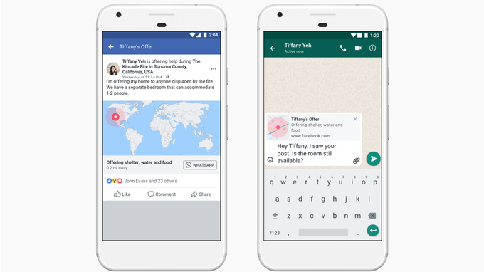 Además, Facebook Crisis Response ahora funciona con WhatsApp . Esta integración particular es bastante liviana: para ser claros, todo el conjunto de características no llegará a WhatsApp. Pero las personas ahora pueden ofrecer o solicitar ayuda a través de la aplicación de mensajería, en lugar de usar solo Facebook Messenger.