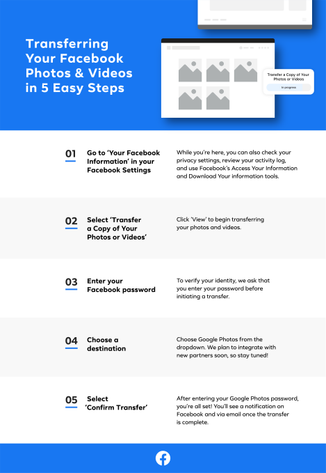 Para usar la función, los usuarios de Facebook deberán hacer clic en “Configuración”, seguido de “Su información de Facebook” y luego “Transferir una copia de sus fotos y videos”. Facebook le pedirá que verifique su contraseña para confirmar su identidad para continuar. En la siguiente pantalla, podrá elegir “Google Photos” como destino en el cuadro desplegable “Elegir destino” que aparece. También necesitará la información de su cuenta de Google para autenticarse con su servicio antes de que comience la transferencia.