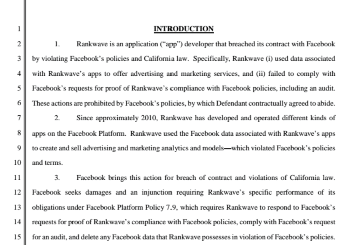 TechCrunch obtuvo una copia de la demanda que alega que Rankwave utilizó de forma incorrecta los datos de Facebook fuera de las aplicaciones donde se recopiló, demoró intencionalmente la respuesta a una orden de cese y desistimiento, afirmó que no violaba la política de Facebook, mintió sobre no usar su aplicaciones desde 2018 cuando se accedió a ellas en abril de 2019, y luego se negaron a cumplir con una auditoría obligatoria de sus prácticas de datos. Se supone que los datos de la plataforma de Facebook no deben reutilizarse para otros objetivos comerciales, solo para que el desarrollador mejore la experiencia de usuario de su aplicación.