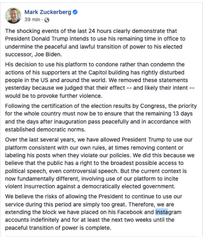 “Creemos que los riesgos de permitir que el presidente continúe utilizando nuestro servicio durante este periodo son simplemente demasiado grandes”, escribió Zuckerberg en un mensaje en Facebook.