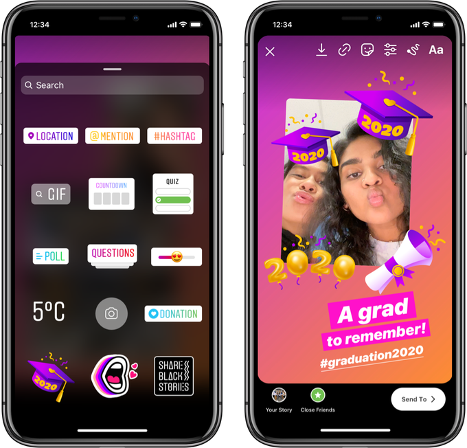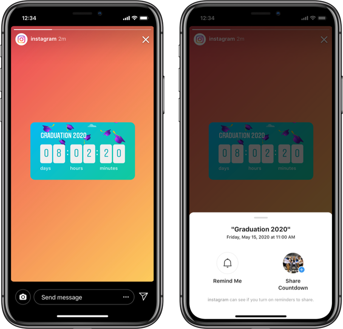 Comenzando hoy 11 de mayo, Instagram agregará una nueva pegatina de cuenta regresiva de graduación para Stories que promoverá la ceremonia de graduación del 15 de mayo. Los usuarios también pueden volver a compartir desde la historia principal de @instagram y establecer un recordatorio sobre el evento. Instagram también está presentando dos nuevos desafíos de hashtag, incluido un desafío #GradPhotoChallenge y #MySeniorQuote para presentar citas de personas mayores en los EE. UU.