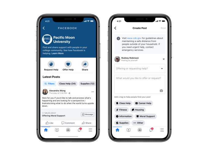 En las semanas posteriores a la graduación, Facebook comenzará a permitir que estudiantes, maestros y ex alumnos en los EE. UU. Ofrezcan y soliciten asistencia en sus comunidades universitarias en su función de Ayuda comunitaria. Esto se centrará en categorías como ayuda profesional, vivienda, apoyo moral, aptitud física y suministros.