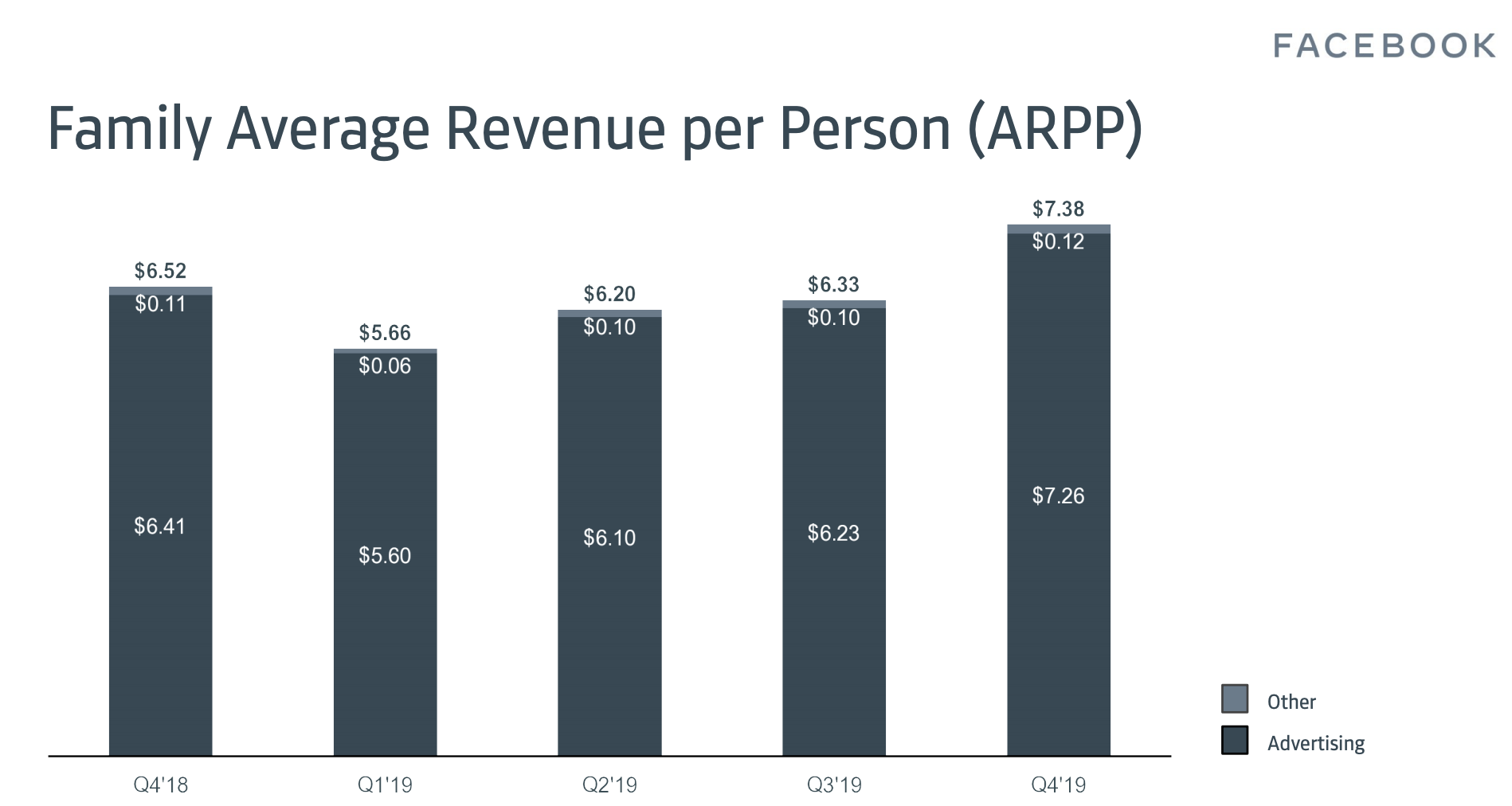 Facebook lanzó una nueva estadística con este informe de ganancias: Ingresos promedio familiares por persona. Eso es esencialmente los ingresos totales de la compañía divididos por el total de usuarios en Facebook, Messenger, Instagram, y WhatsApp Claramente, la compañía está tratando de usar los crecientes ingresos publicitarios de Instagram para hacer que el resto de la compañía se vea más fuerte. Esto podría ayudar a enmascarar los cambios en los ingresos de la aplicación de Facebook a medida que los adolescentes buscan feeds de contenido más juveniles.