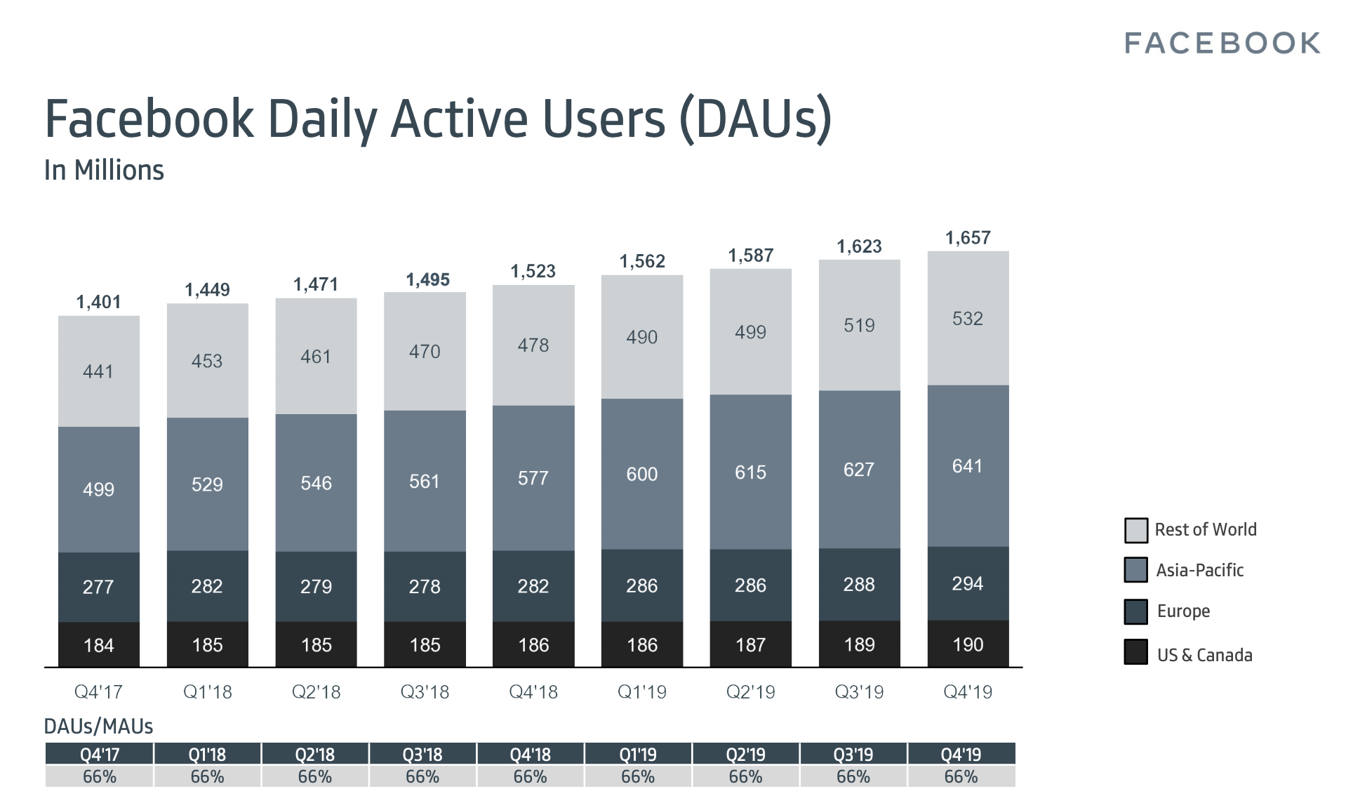 Facebook superó las estimaciones de Wall Street en el cuarto trimestre, pero la desaceleración del crecimiento de las ganancias superó el precio de las acciones. Facebook alcanzó los 2.500 millones de usuarios mensuales, un aumento del 2%, de 2.45 millones en el tercer trimestre de 2019 cuando creció un 1.65%, y ahora tiene 1.66 millones de usuarios activos diarios, un 2.4% más que 1.62 millones el último trimestre cuando creció un 2%. Facebook generó $ 21.08 mil millones en ingresos, un 25% más año con año, con $ 2.56 en ganancias por acción.