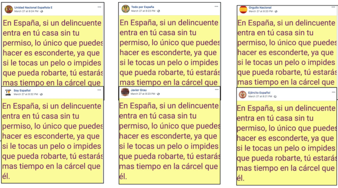 Su informe detalla cómo se publicaron publicaciones idénticas palabra por palabra en varias páginas de Facebook y grupos en la red con solo unos minutos de diferencia, sin nada que indique que no eran publicaciones originales en cada página.