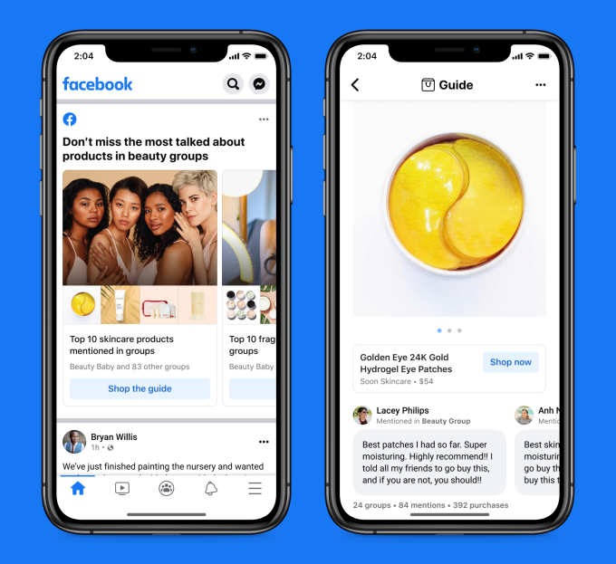 Facebook también dijo que los usuarios a menudo piden recomendaciones de productos en grupos, piense en un grupo de cuidado de la piel o maquillaje, por lo que ahora, si un usuario menciona un producto que figura en una tienda de Facebook, puede etiquetarlo e incrustarlo en su comentario. Las principales recomendaciones de productos de los grupos aparecerán en los canales de noticias de los usuarios.