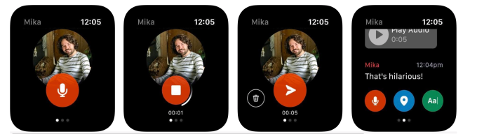 La aplicación le permite enviar una variedad de mensajes con solo un toque, incluidas grabaciones de voz, emoji, compartir ubicación, garabatos e incluso entrada de dictado, similar a cómo funciona hoy en día el uso de iMessage desde su Apple Watch. Sin embargo, estos mensajes se envían a través del servicio Messenger de Facebook, no SMS o iMessage.