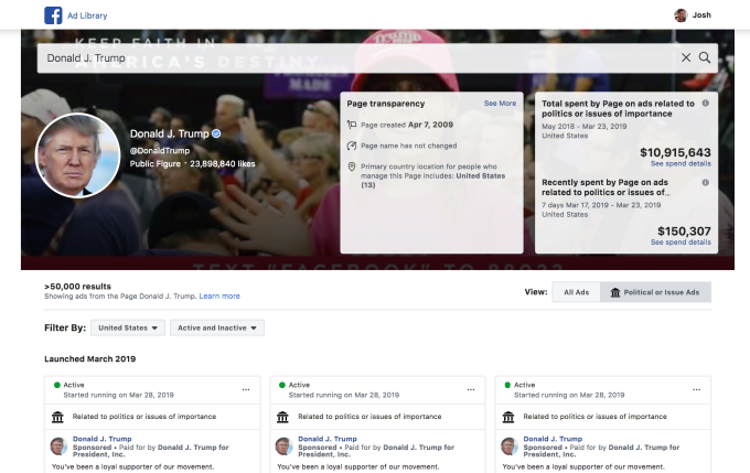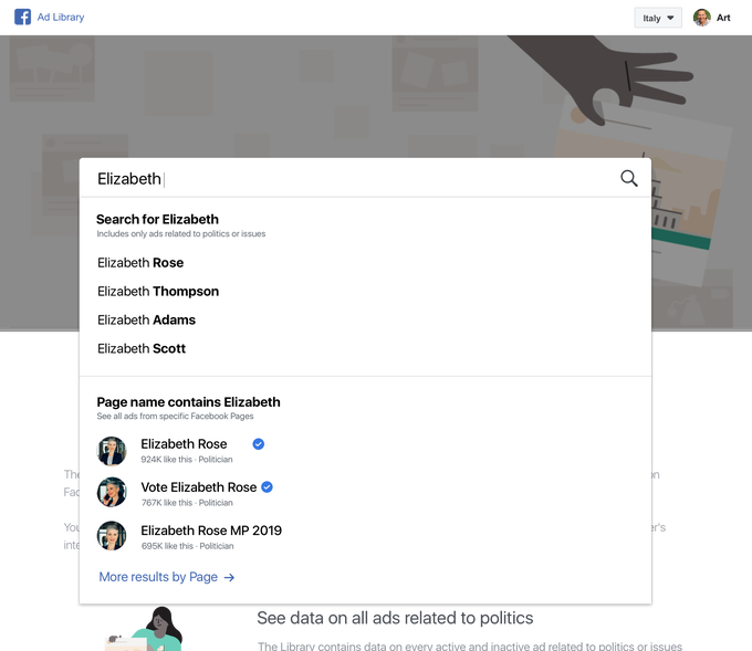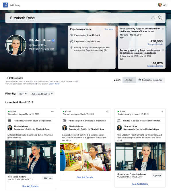 El Archivo de anuncios de Facebook que se lanzó en mayo de 2018 anteriormente solo incluía anuncios relacionados con cuestiones de política o políticas, pero ahora muestra todos los anuncios activos sobre cualquier cosa, así como anuncios políticos y de emisión inactivos. Muestra las fechas de creación de la página, las fusiones con otras páginas, los cambios en el nombre de la página y desde dónde se gestiona una página, y la opción de informar un anuncio de infracciones de políticas, todo lo cual estará visible en una nueva pestaña de Transparencia de página en todas las páginas. Los usuarios pueden buscar anuncios políticos y emitir por palabra clave u otros anuncios por nombre de página, y Facebook le dará una mano con sugerencias de autocompletado y búsquedas anteriores. La Biblioteca también muestra el total de anuncios políticos de Pages en la última semana o desde mayo de 2018. Y a mediados de mayo, Facebook pasará a ofrecer informes de la Biblioteca de anuncios que se pueden descargar diariamente, así como mensuales y trimestrales, en lugar de solo semanales, como lo hace actualmente. .