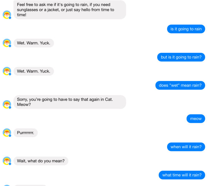 Una interacción ridículamente mala con el viejo bot de chat de Messenger Poncho The Weather Cat