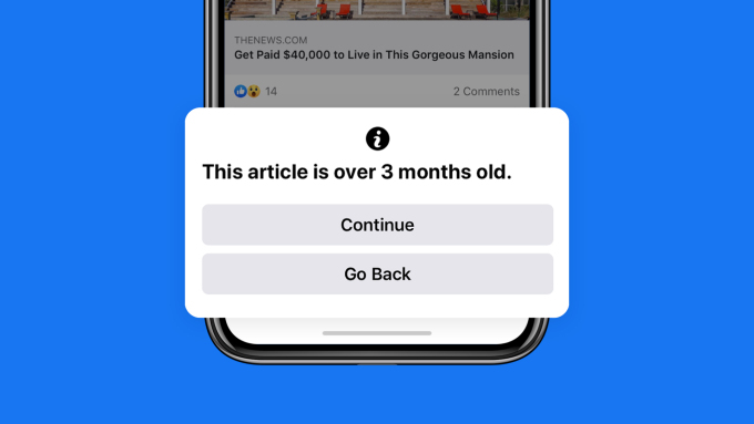 Facebook anunció el jueves que presentaría una pantalla de notificación que advierte a los usuarios si intentan compartir contenido con más de 90 días de antigüedad. Se les dará la opción de “regresar” o hacer clic si aún desean compartir la historia sabiendo que no está actualizada.