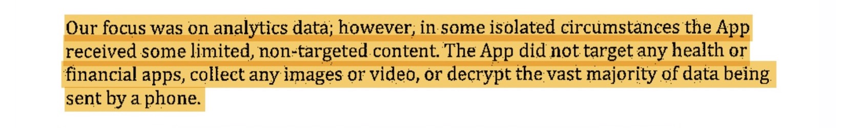 Facebook dijo anteriormente que "ignora específicamente la información que se comparte a través de aplicaciones financieras o de salud". En su carta a los legisladores, Facebook se mantuvo firme y dijo que su recopilación de datos estaba centrada en "análisis", pero confirmó que "en algunas circunstancias aisladas, la aplicación recibió algunos contenido no dirigido limitado ".