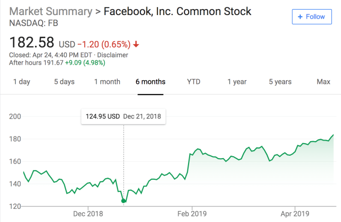 Una multa masiva se cierne sobre la cabeza de Facebook, pero por lo demás tuvo un informe de ganancias muy fuerte en el primer trimestre. Facebook alcanzó 2,380 millones de usuarios mensuales, un 2,5 por ciento más que los 2,32 mil millones en el cuarto trimestre de 2018 cuando creció un 2,2 por ciento, y ahora tiene 1,56 mil millones de usuarios activos diarios, un 2,63 por ciento más que los 1,52 mil millones del último trimestre cuando creció un 2 por ciento. Facebook obtuvo $ 15.08 en ingresos, un 26% más año con año en comparación con las estimaciones del consenso de Refinitiv de $ 14.98 mil millones en ingresos.