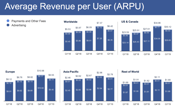 Facebook ha logrado mantener su proporción del 66 por ciento de usuarios diarios y mensuales, lo que demuestra que las personas no necesariamente lo usan menos a pesar de la reacción negativa. Pero Facebook no superó su cuenta de 186 millones de usuarios diarios en los EE. UU. Y Canadá, donde se atascó el último trimestre, pero al menos agregó 4 millones en su lucrativo mercado europeo, además de tener grandes ganancias en Asia-Pacífico y el resto. De las regiones del mundo. En cuanto a la monetización, Facebook logró ganancias modestas en el ingreso promedio por usuario en todos los mercados en comparación con el tercer trimestre de 2018 (excluyendo el cuarto trimestre cargado de vacaciones). Europa lo hizo especialmente bien, creciendo ARPU 8.2 por ciento.