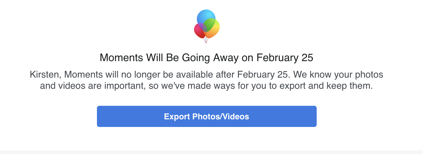 Los usuarios de los momentos deben ver un mensaje advirtiéndoles del final inminente de la aplicación. Debajo del mensaje hay una opción para exportar fotos y videos.
