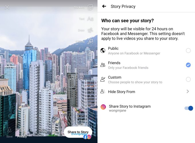 La captura de pantalla de la función de publicación cruzada de Facebook a Instagram se generó a partir del código de la aplicación Facebook para Android por Jane Manchun Wong. Es la reconocida experta en ingeniería inversa que proporcionó a TechCrunch consejos sobre docenas de características inéditas que se lanzaron oficialmente. Cuando haya filmado una historia de Facebook y esté a punto de publicarla, puede tocar Privacidad para revisar con quién está compartiendo. Además de las opciones Público, Amigos, Personalizado y Ocultar desde, Facebook está probando una palanca Compartir en Instagram que parece activar la publicación cruzada continua de esa publicación y las futuras.