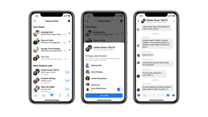 “Queríamos crear un producto en el que fuera fácil para los compañeros de clase conocerse, fomentar nuevas relaciones y también iniciar conversaciones fácilmente”, explica Charmaine Hung, gerente de productos del campus de Facebook. “Y realmente pensamos que Campus es más relevante que nunca en este momento. Con COVID-19, vemos que muchos estudiantes no regresan al campus en el otoño. Ahora, las clases se llevan a cabo en línea y los estudiantes están tratando de reaccionar a esta nueva normalidad de cómo es conectarse con clubes y organizaciones que les interesan, cuando no están juntos ”, agregó.