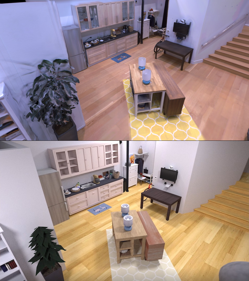 Los entornos, que son escaneados e interpretados por una IA entrenada en gemelos digitales precisos, son dimensionalmente precisos hasta el punto en que, por ejemplo, se pueden calcular números exactos para el área de la superficie de la ventana o el volumen total del armario. Es un campo de juego útilmente realista para los modelos de IA, y aunque el conjunto de datos resultante no es interactivo (todavía), refleja mucho el mundo real en toda su variación. (Es distinto del conjunto de datos interactivo de Facebook, pero podría formar la base para una expansión).