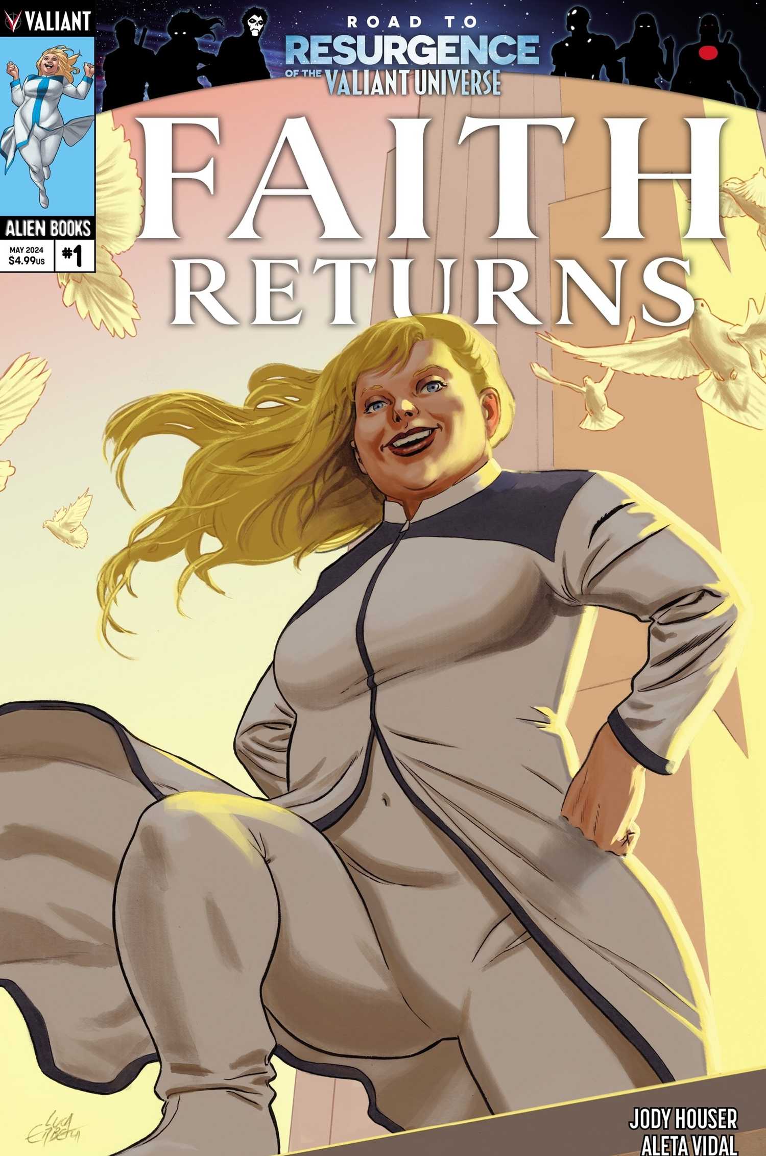 La fe regresa El número 1 está escrito por Jody Houser y dibujado por Aleta Vidal. Anteriormente, Faith fue acusada de asesinato, lo que la obligó a pasar a la clandestinidad. Cuando los fanáticos conocen a Faith, ella está trabajando en un trabajo insatisfactorio como periodista. Faith debe disfrazarse y usar un alias cuando está en público. El general de brigada Capshaw se acerca a Faith y le ofrece un trato: hacer un trabajo para ella y su nombre quedará limpio.